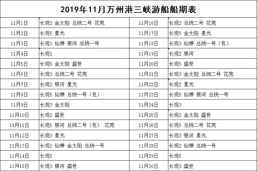 2019年11月萬(wàn)州港船期信息表
